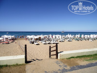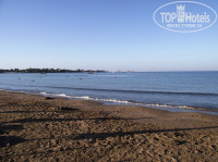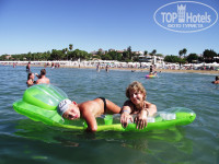 Море находится от отеля достаточно далеко, говорят около 1 км, но пройдя один раз пешком, дорога не показалась нам утомительной, а наоборот очень своеобразной и интересной. С детьми мы шли не более 10-15 минут. Улочки петляют мимо турецких двориков с курами и петухами, колоритных домиков с бараньими черепами над входом, садиков с фруктовыми и оливковыми деревьями и цветущими кустарниками, часть пути идёт мимо пустыря, заросшего травой, выжженной солнцем и издающей пряные ароматы, невдалеке виднеется мечеть и развалины древней крепости, ближе к морю начинаются торговые лавочки, кафе и маркеты, а также отели прибрежной полосы. Особенно приятно прогуляться рано утром, часов в 8, пока ещё не было первого автобуса, когда пляж почти безлюден, море чистейшее, а солнце ласковое и мягкое. Если не хочется идти пешком, можно воспользоваться бесплатным отельным шатлом, который ходит каждый час, места хватало всем и всегда, если народу было много, автобус делал два рейса. Так как бесплатного бара на пляже нет, то воду необходимо брать с собой. При желании можно перекусить и выпить в платном баре, которых на набережной великое множество на каждом шагу. Пляж песчаный, что очень хорошо для детей, наши мальчишки в перерывах между купанием с большим удовольствием строили крепости и рыли каналы, а малышня лепила куличики. Вход в воду хороший, пологий, глубина нарастает плавно, что также очень удобно для детей любого возраста. На пляже есть душ и кабинки для переодевания, лежаки и матрасы в достатке бесплатно, пляжные полотенца выдают в хамаме также бесплатно по карточке с рецепшена, замена 3 раза в неделю утром с 9 до 11, при утере полотенца - штраф 10$.
