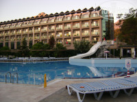 Прибыли в отель около 8.30. Решили не полагаться на удачу и сразу же на ресепшене отдали небольшой презент (бутылку водки и пачку сигарет) с просьбой поселить нас в номера в одном из новых корпусов. Нас попросили подождать до 14.00, к чему мы были готовы. Оставив чемоданы возле ресепшена, переоделись и пошли на завтрак. Здесь нас ожидал настоящий ШОК! Нет, скудность выбора еды в столовой нас не поразила. Нам вполне хватило мюслей, вкусно приготовленного в виде рулетиков картофеля, типичной для Турции соевой колбасы, яиц и свежих овощей. Поразила нас столовая. Мы были готовы, что это столовая с пластиковыми столами, а не ресторан, но.... Ни одного чистого стола, все завалены горами из грязной посуды, неубранные кусочки еды на полу, полно мух. Только благодаря просьбе к официанту вытереть один из столов нам удалось сесть и позавтракать. Официанты в столовой ползали как сонные мухи и еле-еле убирали столы к обеду. Добавило незабываемых впечатлений и созерцание грязных залапанных стекол и таких же стеклянных столов в холле. Прогулка же по территории отеля, загаженной пластиковыми стаканчиками, убило всякое желание здесь отдыхать. Но нужно сказать, что такую несусветную грязь на территории и сонных официантов мы видели только в этот день, день нашего приезда. Возможно у них накануне был какой-то праздник и поэтому персонал бездействовал. В остальные же дни нашего пребывания в отеле вплоть до 2 сентября было намного чище, официанты и уборщики трудились как муравьи. Другое дело, что их там мало для такого количества туристов в отеле, которые к тому же ведут себя как свиньи.