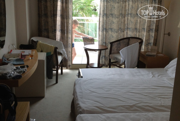 Что могу сказать... То, что отель ориентирован на немцев, видно сразу... К турфирме Нева, через которую оформляли путевку, претензий нет. Отельный гид Оксана отзывчива, доброжелательна. Гид Елена, которая нас встречала, тоже. Приехали мы вечером, на ресепшен оформили быстро, даже без документов (так получилось, что улетели вообще без ничего), отправили в столовую поужинать. Первоначально дали номер на первом этаже, в самом углу (124). Переночевав ночь, поняли, что анимация в соседнем отеле и вид на стену пальм нам категорически не нравится...) Утром поменяли (без доплат) абсолютно на такой же номер, но на пятом этаже (522). В номере две кровати и маленькая раскладушка, продавленная до самого пола. Сейф, шкаф, телек (один русский канал).