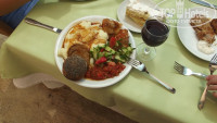 И так, приехали мы (нас было 6 человек) около 20.00. Стали оформляться, попросили 3 номера, чтобы были рядом, т.к. рядом номеров не было, нам предложили до утра один семейный 163 на 4 чел и на 2-х 755. Берем ключи от номеров, на выходе с ресепшен, нас ждет машинка с веселым водителем с которым мы с ветерком мчимся до номеров. Т.к. было время ужина, довез сначала до 755, отнес чемоданы, подождал наших людей, потом отвез нас всех к 163, который находится над рестораном. Начитавшись отзывов перед нашим отъездом мы боялись, что еды нам не достанется, т.к. время уже под конец ужина, заходим в ресторан, я например была в шоке от такого кол-ва еды, овощи тушеные, в виде салатов, котлеты, супы, макароны, сладости. Значит поели, пошли осматривать окрестности. Сходили на море, искупались, поплясали на дискотеке.
