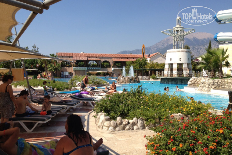 Территория отеля ухоженная, зеленая, шикарный вид на горы. Огромные бассейны с новыми водными горками. Целый аквапарк на территории отеля.