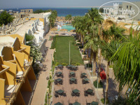Выходя из этого холла вы попадаете на территрию отеля - два ряда двухэтажных корпусов с выходящими внутрь двора окнами и балконами, достаточно ухоженный дворик, который имеет некоторую растительность в виде лужайки и пальмовой аллеи, поливаемых водой из канализации. Периодически во дворике стоит жуткая вонь и по вечерам вылетают на ужин местные мелкие комары. Не знаю, как это переносят жильцы комнат первых этажей, что непротив лужайки... Я жила на втором этаже примерно по середине корпуса - ночные набеги комаров, лезших из кондика, повторялись из ночи в ночь, так что я включала фумигатор, предусмотрительно захваченный из дома.