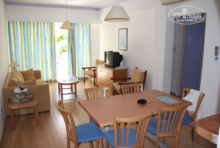 Были в отеле с 05.09 по 18.09. Летали от Библио-Глобус, авиакомпания Трансаэро все вовремя и без нареканий. Теперь конкретно по отелю, приехали в 13-30, оплачивали номер в главном корпусе. Получили ключи в 15-00 от двухспального номера в вилле Geranium. Только разобрали чемоданы и разложили вещи, последовал звонок с ресепшен о том, что номер на следующее утро надо освободить, нам будет предоставлен другой номер. Сообщить об этом сразу возможности видимо не было, ну да ладно упаковали все обратно и довольные пошли на море. До моря действительно 5-7 минут, переходили дорогу у отеля Алое. С размещением в наш заезд постоянно были проблемы, некоторых отправляли в другие отели сети Лептос. Мы на утро перехали на самый верхний этаж основного здания, в крайний номер с отличным видом на крепость Пафоса и потрясающими закатами.