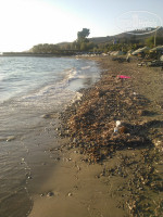 Железные балки торчащие из воды, грязь на пляже, убогий песок и вход в море.
