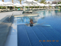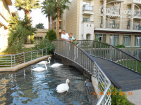3. П Л Я Ж И Б А С С Е Й Н Ы: Пляж большой, собственный и всего хватало.Два бара на пляже.Бармен на пирсе М О Л О Д Е Ц , жаль, что забыл, как зовут, но фотка есть и выставляю. Правда, в прошлом году был другой, но тоже молодец. Сейчас строится новый корпус, но как мы все поместимся на этом пляже без его расширения, не представляю. Пляж большой, чистый, но вход в море галечный и нужна особая обувь. Но это недостаток всех пляжей - галька. Бассейн большой ,всегда Ч И С Т Ы Й и не вонючий. Правда сами купались в море, а в бассейне только фотографировались, мы все время ходили мимо на пляж и я постоянно прыгал в него и шли дальше. Мы все дни провели, отдыхая на пирсе и плавали с пирса и поэтому галька нас не трогала, но видели, что все бультыхались на пляже довольные.Я даже с воздушными змеями бегал по пляжу.Хочу отметить, что только вход в море из гальки, весь остальной пляж - песочек. Есть еще крытый зимний бассейн с подогревом, в нем мы только фотографировались. Есть еще большой водоем для лебедей и просто для красоты. Из - за гальки на входе в море Ч Е Т В Ё Р К А , но это просто придирка.