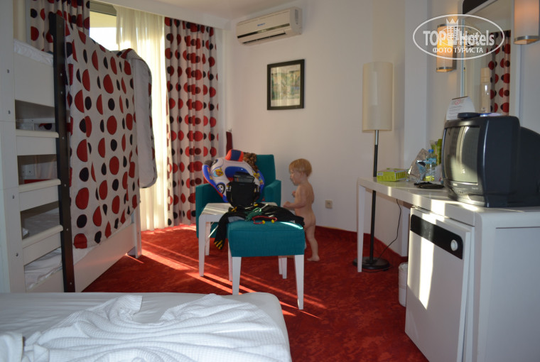 Номер: номер был нормальный, 2 кровати, которые мы соединили и 2-х ярусная кровать для детей. Телевизор допотопный, но смотреть можно, 2 русских канала.