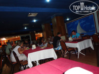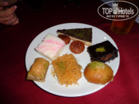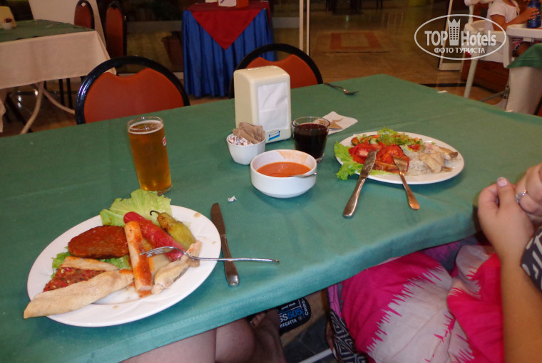 После купания пошли на запах еды в основной ресторан. Шведский стол с огромным выбором блюд на любой вкус: гарнир - картошка, рис, макароны, каждый день в разном виде. Курица, рыба, сосиски и котлеты тоже каждый день в разном виде (жаренные, в виде жаркоэ и с разными соусами). Салаты и закуски описать не возьмусь - от огурцов с помидорами до оливье. Разнообразно и вкусно каждый день. Всегда есть свежий хлеб и на обед суп-пюре. Мы не самые любители сладкого, но его выбор огромный, пару раз набирали полные тарелки и все было очень вкусно. Напитки - чай, кофе, пиво, вино, джин, водка, ракки, кола, спрайт, что-то подобное тану/айрану, штук 6 видов напитков типа Invite/Zukko (жена вишневым вино разбавляла) в неограниченном количестве в ресторане, лобби, снек-баре и у бассейна. Пару раз ели турецкие лепешки - очень вкусно.