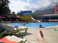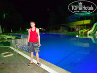 Когда становилось лень идти до пирса и спускаться по лестнице в соленое море перползали к бассейну. Вода чистая. Глубина от 1м 40см до 1м 80см в осовном бассейне. Есть детский лягушатник. Днем проводилась водная аэробика, водное поло и развлечения у бассейна. В положенное время включались водные горки. Пару-тройку раз прокатились - вроде никаких гвоздей по пути не оказалось - очень весело.