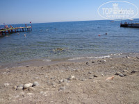 Как и написано в описании - пляж галечный, при заходе в море галька становится все больше и больше и перерастает в камни. Купались с пирса (есть 2 лестницы для захода в море). При спуске с лестницы сразу глубоко.