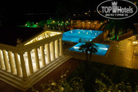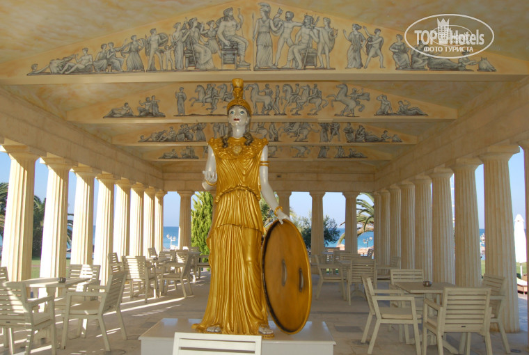 Территория весьма вместительная, есть несколько корпусов, есть два теннисных корта, мини-клуб для детей, и там так же есть мини-птичник, где живут попугайчики!))) Так же днем и вечером можно отдохнуть как на открытой веранде, так и в беседке "Парфенон"!) Вечером беседка выглядит волшебно, особенно лампочки на потолке, что воспринимаются как звездочки! Территория ухоженная, чистая! Есть аллея, которая простирается вдоль всех корпусов, стоят скамейки. Рядом с отелем находится мини-маркет, где и располагается винный погреб "Kava IDEA", куда не только ходят отдыхающие этого отеля и близближайших, но и так же сюда привозят туристов, кто ездит на разные экскурсии. Там действительно огромный выбор вин, шампанского и коньяка! В мини-маркете продается оливковое масло, оливки, сладости, косметика, и так же разнообразные сувениры и коньяк, но в маленьких объемах. Коньяк "Metaxa" очень вкусный, бесподобный, берите и не пожалеете.