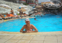 Территория отеля небольшая, но, не смотря на это, на ней расположены 3 водные горки и 2 бассейна, турецкая баня. Баня в отеле-класс!!! Массаж-супер!!! Массаж стали делать сразу с первых дней с увлажнением кожи маслами, поэтому загар ложился ровно и красиво.