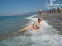 Большой плюс отеля - отель находится на самом берегу моря, несмотря на то, что это 4 и находится на второй линии. Выйдя из отеля через подземный переход, сразу попадаешь на пляж, который начинается маленьким цветущим садиком, где расположена детская площадка и маленький бар, где можно взять напитки. Пляж довольно большой для этого отеля, места хватало всем, шезлонги и матрасы приличные. На море всегда волна. Заход в море ограничен, по-видимому, расчищен в центре пляжа, в других местах заход в море плохой, можно травмироваться.