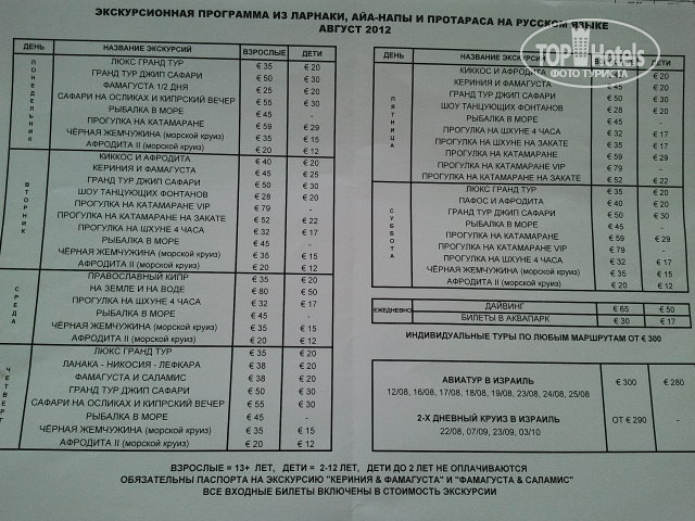 Здравствуйте. Наконец-то напишу свой отзыв об отеле. Отдыхали с подругой с 16.08.2012 по 26.08.2012 года. Прилетели мы 5 утра, в отеле были в 7.00. Разместили нас в 12.00, до этого времени вещи оставили, поели и пошли на пляж. Номер у нас был в главном корпусе (№ 110), окна выходили на улицу и кафешки. В первую ночь музыки слышно не было, ноя думаю потому-что от усталости мы "вырубились". На следующую ночь - музыку было очень слышно, но при закрытом балконе - спать можно. Про сам отель писать не буду - присоединяюсь ко всем отсальным отзывам, но на 3 день мы обнаружили в номере (в постеле) клопов. При обращении на ресепшен нам сказали, что они про это знают и уже вызвали службу, чтобы их потравили. Однако, после того, как мы пришлим с пляжа, клопы не сдохли, а ползали по всему номеру. Еще раз обратившись на ресепшен, нас переселили в другой корпус, где номера были в 100 раз лучше, больше и убирали каждый день. Брали полупансион (завтрак-ужин) - не советую, т.к. каждый раз платить за любые напитки накладно, лучше берите "все включено". Обедали в кафе, недалеко от отеля ("Королева Вик") - все очень вкусно!!!! В отеле мне еда не очень понравилась, на любителя. Экскурсии: ездили на "Осликах" - суппеерр!, "Првосдавный Кипр" - эксурсия интересная, но очень долгая и сложная, ехать очень далеко и высоко в горы, "Ночь Дионисия" - обязательно сходите!!!, "поющие фонтаны" - сами приехали и купили билет. У Библиео глобуса мы взяли одну лишь экскурсию, остальные брали на улице в Эмане (находится недалеко от отеля) - разницы нет, а цены дешевле (см.фото).