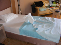 Заселение и номер - нас не обошел фактор вымогания денег, вездесущий Рустам сказал , что надо дать «всего лишь» 100 уе с трех семей, и все будет в порядке. Пришлось таки дать как он сказал- торг не прошел в этой ситуации. Правда мы поставили условие- что бы мы все были рядом. Номера дали на 4 этаже с выходом во двор в правом крыле (если стоять лицом к главному входу). Как и просили – мы все были рядышком. Номера большие, чистые, мебель новая , чистенькая, есть бесплатный сейф, в шкафу много вешалок. Есть балкон с которого открывается замечательный вид на двор отеля и на море. На балконе есть сушилка для белья. Я брала с собой прищепки – очень пригодились для маленьких вещей. Уборка происходила ежедневно, смена всех полотенец тоже ежедневно. Лебедей и не только крутили по настроению, не зависимо от оставленного доллара. Пополнение мини бара ежедневное, даже если бутылка стоит на холодильнике (мы ребенку ставили , чтоб нагревалась), все равно поставят еще две в холодильник. У нас было так – две пол литровых водички негазированных, две 0,33 газировки и две пол литровых колы. Кондиционер централизированый, но уже был отключен.