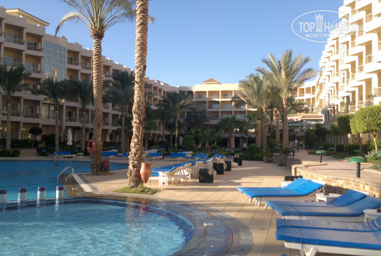 Территория отеля не большая, но это и плюс - далеко ходить не надо. 2 бассейна - один теплый поменьше, второй холодный побольше, в холодном плавали только русские. Зеленью засажено все на территории, ну за отелем - понятно (Египет все таки).