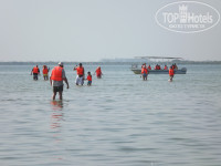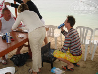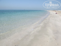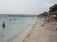 Пляж возможно самое «слабое звено» отеля. Слева пляж ограничен забором, за которым находился узел погрузки-разгрузки щебня, а вовсе не цементный завод, как писали ниже. Справа пляж ограничен пирсом. Пляж небольшой, но места хватало всем. На небольшую протяженность – три душа для смыва соленой воды и большой туалет с душевыми. Да, мы там насчитали порядка 25 лежаков, но ведь и в отеле всего 52 номера. Так как отель небольшой, круглый стол обмена впечатлениями устраивался прямо в воде – очень быстро можно подружиться с отдыхающими. А также прямо на пляже множество столиков со стульями под зонтиками. Мы принципиально не загораем, поэтому и не стремились овладеть лежаками, чаще отдыхали за столиками. Как писали ниже, при вроде бы гладкой поверхности воды, в воде присутствует довольно сильное течение. Это было даже интересно – доходишь ( я не могла доплыть – как беговая дорожка) до самой крайней точки пляжа , поднимаешь ноги – и тебя как на мягких качелях несет в противоположную сторону. Но самое главное – выходишь из отеля, поворачиваешь направо, 20 минут пешком – и вот он «эксклюзив». На громадном пляже персидского залива Вы будете практически одни. Песчаный вход и чистейшая вода. Единственное – советую запастись солнцезащитным кремом, и накидками. Укрыться от солнце негде.