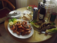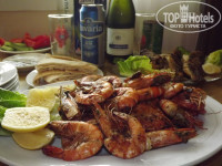 Сразу предупреждаю, что лица, привыкшие к «ол инклюзив» в Турции и Египте будут жестоко разочарованы. Питание по принципу «мы едим чтобы жить, а не живем чтобы есть». С голоду не умрете, но фруктов не дают, разнообразной выпечки нет. У нас был завтрак, ужин. Не буду писать про завтрак – стандартно, не считая постоянного присутствия двух видов маленьких пирожков из тонкого теста - самсы. На ужин – один вид куры, один вид рыбы, один вид мяса, два вида гарнира. На десерт либо мороженое, либо желе, либо суфле. Мы имеем избыточный вес, и то, что никаких соблазнов было просто замечательно. Понравилась бодрость во всем теле, без ощущения переполненности от того, что перепробовал кучу еды. Понравилось, что ужин проходил практически на пляже, под открытым небом. Да, забыла написать, что отель Фламинго Бич является местом, откуда на крабовую охоту везут из всех Арабских Эмиратов. Благодаря этому крабовый суп на ужин был практически в неограниченном количестве. А наблюдать как люди приходят с уловом, а потом им его готовят – просто доставляло удовольствие во время ужина и лично нам нисколько не мешало. Я даже скажу больше – так как еда не самая крутая фишка отеля – лучше бы было брать только завтрак. Выходишь из отеля, такси - 5 дерхам (43 рубля) и тебя отвезут в местный супермаркет Лулу. Очень приличный выбор продуктов. Там даже есть кулинария. Цены примерно такие же как и в России, а на некоторые продукты гораздо дешевле. Очень качественные и вкусные молочные продукты, соки, много распродаж. Можно купить рыбу, мясо и отдать в отель для индивидуального приготовления, а можно придумать романтический вечер с мангалом на берегу моря. А один раз, когда интернациональная бригада (проживающие в отеле и местные) наловила много некрупной рыбы (ну не шла крупная в тот вечер), отдыхающие отдали ее на кухню и из нее на нашу компанию приготовили целый таз литров на 8 обалденной ухи – мы даже не стали брать ужин. Можно за 10 дерхам (85 руб) съездить на рыбный рынок – очень интересно смотреть на свежие дары моря. Мы там купили крупнющие тигровые креветки за 35 дерхам (300 рублей) за кг и нам их вместе с нашей выловленной рыбой приготовили гриль и принесли в номер – просто супер. А некоторые отдыхающие питались сразу по выходе из отеля. Скажу честно – забегаловки выглядят страшновато, но по отзывам очень вкусно и дешево.