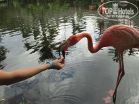 Территория отеля оформлена искусственными водоемами и мостиками через них. В этих прудиках плавают рыбки, а этих рыбок ловят цапли, фламинго и еще какие-то птички мною не идентифицированные, так же ходят павлины, гуси, утки, вечером появляются водяные черепахи, летают большие летучие мыши, выходят жабы и маленькие ящерки. Всю эту фауну можно кормить взятым из ресторана хлебом, в частности фламинго можно кормить из рук! Вся территория утопает в зелени, что очень приятно!