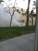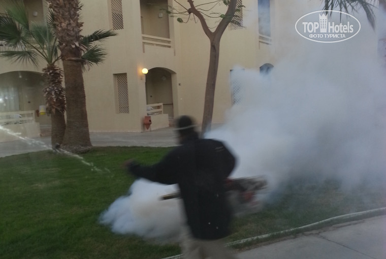 Еще во всех отелях травят мух,такой штукой похожей на большой фен,вонь стоит просто ужасная.Процедура эта не помогает,через полчаса мухи и комары возвращаются снова!В соседних отелях это делалось по вечерам,и только в нашем в 5 утра!Грохот стоял такой,что спать было невозможно!