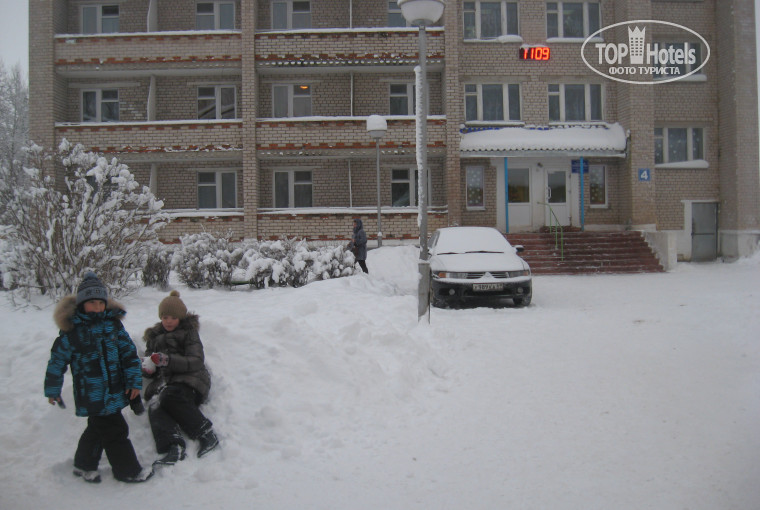 Город Великий Устюг - 7 км, Вотчина Деда Мороза - 22 км. В пяти мин. ходьбы деревня. Обычная: дома и церковь (довольно красивая). До города ходит автобус, видела и такси.