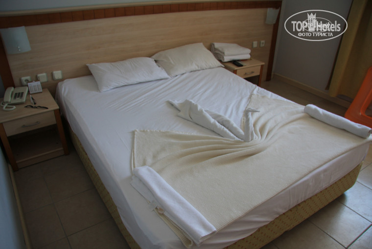 Заселение. Прибыли в отель около 9 часов вечера, сразу отправили на ужин, с выпученными глазами от шума и гама, и непонятности попервой происходящего что-то поели. Дали номер в новом корпусе, с окнами (мы не сразу это поняли) на другой отель, где музыка просто орала. Я первым делом захожу в туалет и вижу… извините за подробность, что унитаз там не мыли после прошлых жильцов! Зовем персонал, прибежал один посмотрел, другой, потом вместе прибежали с моющими средствами и все тщательно вымыли. Кое как переночевали с этим шумом под балконом. В 10 утра после завтрака пошли на ресепшн просить нормальный номер. Сказали сначали мол идите на встречу с гидом, сходили, гиды у Пегаса это отдельный грустный рассказ. Потом опять на ресепшн. Время 12 дня… у нас нераспокованные вещи, так как неизвестно где поселимся. Сказали ждите. Ждем… За деньги тоже кстати вопрос решить не удалось, так как номеров видимо хороших и правда не было. Дают ключ, специально обученного мальчика и типа идите в новый номер. Идем. Номер на первом этаже, с балконом таким, что не видно ничего кроме зелени у бассейна и толп людей, которые проходя мимо могут разглядеть все, что происходит в твоем номере. Отказываемся. Ждите. Ждем… На третьем этаже освободился номер, но его еще не убрали. Заселяемся туда. Вещи опять таки не разбираем, так как жуткий срач в номере. Решили сходить хоть на море посмотреть и наконец искупаться. Кстати, парни за стойкой плохо говорят по-русски и твердили только «нет проблем». Пришли, обнаружили, что сломан стул и дверь балкона. Обещали прислать мастера, но 10 дней так никого и не было. Первый раз убрались неплохо, правда стекло балкона как было ужасно залапано-заляпано чем-то, так все 10 дней его никто и не мыл… Оставили доллар на кровати. Потом уборки были все хуже и хуже… Раз полы помоет, раз в душе, раз унитаз, один раз даже лебедей из полотенец сделали. А все сразу и каждый раз видимо не судьба! Мы так-то аккуратные, разувались перед входом в комнату, но песок, который повсюду, все равно сыпется, как не старайся его оставить на улице. Вообщем, или денег надо было оставлять больше или не знаю что. Мы перестали оставлять совсем, убивала такая уборка. Зато постель меняли часто, в чем не было как раз необходимости! В номере кондиционер, мы с ним так и не смогли до конца подружиться, мерзли ночью. Дует прям на кровать, интенсивность и температура не особо настраивались в силу устарения модели.