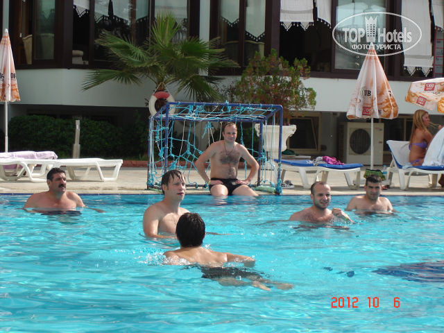 Отдыхали в начале октября 2012 года двумя парами с друзьями. Общее впечатление очень даже положительное. Но опять таки... кто с каким настроением едет. Отдыхали в одно время с девушкой которая оставила крайне недовольный отзыв ниже. По порядку.... Прилетели мы с утра около половины десятого. Сначала сказали заселят после 12.00 когда закончится уборка в номерах. Но пока мы переодевались предложили пройти вчетвером в двухкомнвтный номер до следующего утра. Учитывая, что мы ехали не в номере сидеть-заселились сразу. Вчетвером мы легко переночевали в двух комнатах (правда одна комната была без окон, т.е. жить там реально вчетвером не удобно). На следующий день нам дали второй номер, тоже двухкомнатный. Друзья остались в первом. Нам достался оооочень приличный номер- спальня и комната и телевизором и диванами. Вобщем по заселению вопросов нет. Убирали хорошо, но мы всегда что нибудь оставляли клининг менеджерам (доллар, шоколадку) Море совсем рядышком-3минуты от отеля неспешным шагом. Пирс большой удобный, но лесенки не совсем продуманы- скользко. Территория ухоженная, всегда чистенько. Мужчины у нас в восторге от аквапарка были, сидели на часы смотрели когда откроется. В крытом бассейне никогда никого небыло (наверно потому что он был холодный). Лежаков и у бассейна, и на пирсе и на пляже всегда хватало... но это может быть связано с тем, что мы были последним заездом в отель и люди разъезжались. По питанию... Выбор широкий... На завтрак яйца, овощи, сыр, куча разных хлопьев, выпечка... Обед и ужин- курица каждый день, мясо (не соевое) практически всегда на ужин было, главное найти в каком блюде))))), рыбка, тушеные овощи, дыни, арбузы, сливы... Сладостей куча разных вкусных. Голодными не оставались!! В баре на пляже с 11 утра можно всегда покушать... Еще женщина очень вкусные лепешки делала в баре у бассейна. Только вот в день отъезда(он совпадал с днем закрытия) кушать было страшновато... мне кажется свежего ничего не готовили. А теперь про сервис.... Даже наверно не к отелю претензии то.... а к оператору. Я понимаю, что отель закрывается, но раз уж вы путевки продали- надо наверно как то поддерживать сервис... В ужине аля карт было отказано и компенсировать его каким либо другим способом тоже отказались. Но тут и мы слишком поздно хватились- надо было заказывать с самого начала. Все равно осадок остался. Аниматоры последние 3 дня ВООБЩЕ ничего не делали. Но в целом они молодцы- сначала все было супер, скучать не давали. В лобби баре очень сложно было застать девушку которая кофе готовит... неуловимая какая то)) Но ничего из вышеперечисленного отдых испортить не смогло! Мы ехали с целью загорать, купаться, веселиться. Отель скорее молодежный и 80% туристов русские(были в момент нашего отдыха), поэтому поставленных целей мы достигли! Вобщем если еще им 5ую звездочку дадут.... обязательно вернемся! Букв много, но короче не получилось))