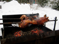 Подъехали к отелю, вокруг высокие заснеженные сосны, пушистые ели, и сосновый бор, аккуратные домики в стиле Швейцарских Альп. Мы приехали в 15.00, раньше объявленного заезда он с 17.00 ,без проблем зарегистрировались, получили ключи вышли из главного корпуса и услышали необыкновенно вкусный аромат жареного на костре мяса. Посреди площади на вертеле жарились два кабанчика, оказалось, что их готовят с самого утра, до начала трапезы еще оставалось немного времени мы переоделись и пошли прогуляться по территории, все в новогодних игрушках и огоньках, елка, рядом ледяная горка, приятная музыка, все располагало к рождественскому настроению. Через час вернулись на площадь к кабанчикам, анимация во всю веселила гостей, конкурсы, шутки, задания на смекалку, было забавно и весело. Взяли ароматного поджаренного мяса, горячего Глинтвейна и устроились за столиком возле большой нарядной елки, не знаю что нас больше пьянило, аромат мяса, горячий глинтвейн или чистейший воздух))))