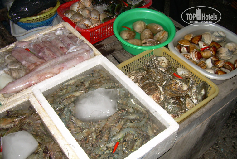 BO KE. От отеля примерно 1,5 км вправо, если стоять спиной к морю. Можно прогуляться пешком, доехать на автобусе (интервал движения 20 мин.) или на такси. BO KE это целый ряд кафе, стоящих на берегу моря, на открытом воздухе, с огромным ассортиментом свежих морепродуктов. Работать начинают с 17,00. Цены ниже чем в центре почти в 2 раза. Лобстеры, креветки, улитки, мидии, гребешки, рак медведь, акула, кальмары, угорь, крабы все очень вкусно, не пробовали лягушку и черепашку (жалко). Все эти деликатесы находятся в аквариуме, показываешь, что тебе нужно, это взвешивают и готовят. Ужинали почти каждый день здесь. Цены на вино и пиво такие же как в магазине. Больше всего понравилось кафе HOANG HON, туда мы и ходили в оставшиеся дни. Персонал приветливый, узнают.
