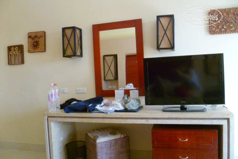 Номер как номер, посмотрели в других корпусах, почти такие же. Вид из номера на сад и бассейн (повезло), есть номера с видом на забор.
