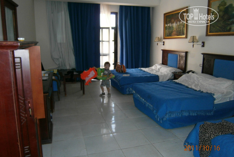 Номер с тремя кроватями, телевизором, мини баром-раз пополнялся по приезду 1л кола, 1л фанты, и15 пакетиков сока.Вся мебель как после фронта.Но мы приехали на море а не искать трещины в стенах... Уборка средненькая, у дочки пропали деньги. так что деньги только все в сейфе хранить,О уборщик отдельная история: в тот момент когда в номере проводилась уборка,я вспомнила что забыла очки, забежав в номер увидела как уборщик пьет наш виски увидев меня он упал на пол начал лихорадочно слушать то пол то холодильник и показывая мне что холодильник сломался! Скандал закатывать я не стала, отдала ему остатки виски, после этого все дни уборщик с большим старанием убирал и крутил на лебедей....