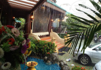 Отель. Состоит из двух корпусов - маленький деревянный, на 3 этажа, все номера с видом на море. Второй стоит в глубине квартала, сразу за маленьким корпусом. (Вид на соседний отель) На территории отеля небольшой бассеин, уютный садик, небольшой спортзал, ресторан с видом на море и лобби.
