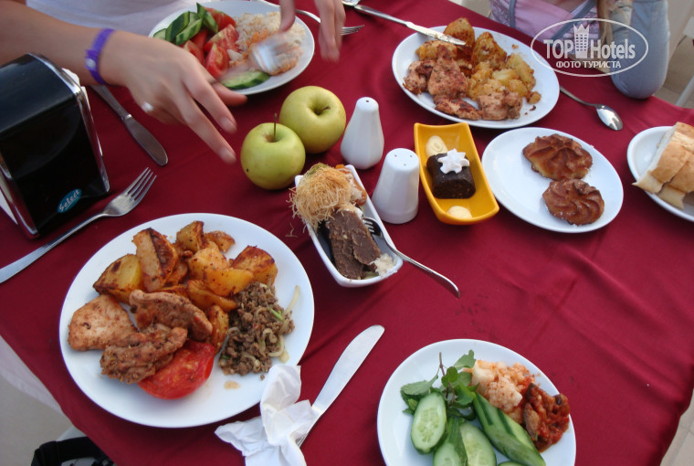 Про питание скажу так: голодными конечно ни когда не оставались, но вот если бы я поехала с муждем, он бы голодал наверно. Ребенок ел исключительно овощи, рис, булки, выпечку, из мяса курицу. Только курицу необходимо было очищать от специи предварительно. Рыба была несколько раз за 10 дней, но напоминала жаренную селедку, вобщем я так и не решилась. За питание я поставила 3, т.к питались исключительно овощами. ну и курицей (как во многих отелях Турции) Забыла, еще был картофель, несколько раз, макарошки бывают в баре у пляжа, можно поесть между завтраком и обедом. Напитки: соки-Юппи, пиво разбавленным показалось, вино не понравилось, с чаем вечные проблеммы, его часто не хватало. Фруктов практически не помню, только яблоки.