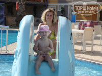 Территория отеля хоть и не большая, но очень даже понравилась. Дочка (2,5 года) по дороге на море всегда радовалась горкам и качелям. Толко днем горки, тк они пласмассовые нагревались сильно, приходилось кататься утром или вечером. Еще есть комнатка, где можно порисовать и пособирать паззлы. С моря всегда можно было зайти в бар, который ближе к пляжу, и перекусить, или выпить кофе.
