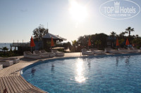 Территория - у самого отеля..конечно по сравнению с тем же Парк конти, - скромновата, но окружающий ландшафт и многое другое оказывают достойную компенсацию. Я бы сказала, сдержанная такая территория, НО .. все необходимое у отеля есть, все рядом - а это очень большой плюс!!! от моря до отеля..если нужно сбегать..все рядом и быстро, что конечно не скажешь про Теодору.. придется прогуляться. Детский бассейн открыт :/ находясь там в апреле и пользуясь защитными кремами могу сказать что солнце однако очень кусачее..ребенок, как не защищали - обгорел, поэтому рекомендовала бы отелю обзавестись тентом у детского бассейна. Взрослый бассейн очень красивый.. стильные лежачки..колоночка с музыкой..вид на гору .. если повезет с ветерком..- ощущения потрясающие.. бассейн нагревается.. принимать солнечные ванны там очень приятно. ВСЕМ очень рекомендую прогуляться на гору слева..там тропинки..оочень красиво..в конце..откроется цветущая поляна..и вид на море..огромные камни.. одинокий рыбак с удочкой)