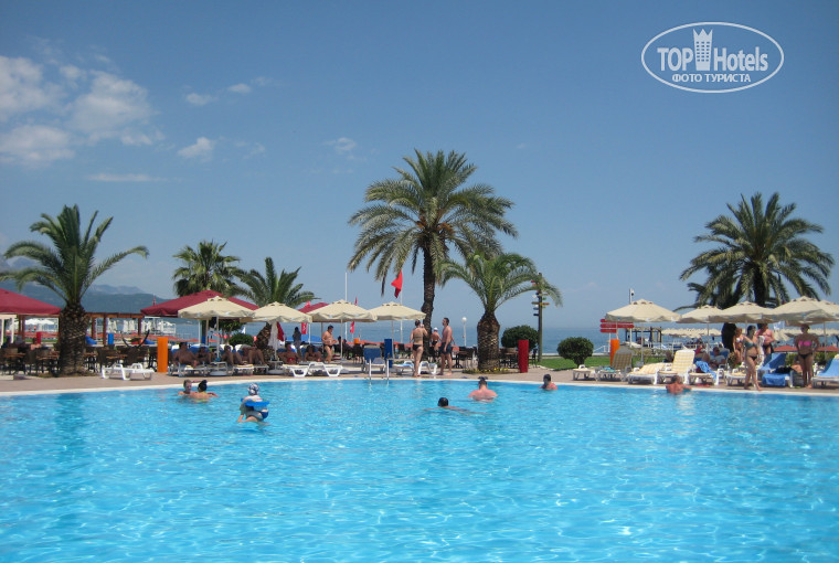 Чистая, ухоженная, просторная, все в зелени. Фрукты спокойно можно рвать с деревьев на всей территории. Пляж довольно большой, один из самых больших в Кемере. Мест на лежаках достаточно в любое время. Также имеются места для отдыха – гамаки и пуфики.