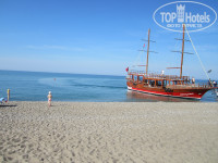 На пляже отеля еще стоял такой шатер – водные виды спорта. Это и банан, и катамаран и парашют и прочие подобные вещи. И еще там можно было купить билет на корабль, который подходил прямо к берегу. Корабль по морю, потом по речке возил в соседний город Манавгат на базар. Мы на нем плавали (ходили, как говорят моряки). Для сына это похоже было одно из самых ярких впечатлений - покататься на «пиратском» корабле. С детьми конечно тяжеловато на рынке. Но мы там купили два кг клубники, в кафе мне приятная женщина за один доллар перемыла клубнику в дуршлаге у меня на глазах. Так мы разделились с мужем - один сидел с детьми с клубникой – я побегала по рынку, набрала всякой всячины, потом я посидела, он тоже осмотрелся. Ну он по улице и по магазинам прошелся ради интереса – как у турков обыкновенная жизнь течет. Еще мы на рынке купили арбуз и привезли его в отель. В отеле конечно комичная ситуация с этим арбузом вышла. Понимали, что в номере с нашими детьми его есть нельзя. Уханькаем всё вокруг. Пошли в пляжный бар. Пошла я просить нож, там менеджер на пару минут как-то растерялся, необычной ему эта просьба показалась. Он объяснял, что столько детей вокруг – как-то неудобно у всех на глазах с ножом, да арбуз есть. Ну говорю мы найдем укромный уголок там на поляне возле мини-клуба вдалеке от всех глаз. Он согласился, Потом нам дали нож, мы только начали отходить, а за нами идет менеджер покрупнее, с улыбкой во весь рот. Позвольте, говорит, нарежу вам арбуз. Нарезал нам его, забрал нож и ушел. Забавно конечно это всё у нас получилось. Но порадовала безотказность персонала в решении этой «проблемы». Потом конечно и в отеле на ужин был арбуз, причем гораздо слаще. Так что чё к чему мы покупали этот арбуз сами не поняли.