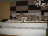 В нашем номере мы жили 2-е взрослых и 3-е детей. Кровать просто огромная и очень удобная, только вот подушки могли бы быть и по мягче (уж очень набиты наполнителем, детям высоковато на таких спать). Двое детей спали на двухярусной кровати, а один ребёнок на раскладушке, и от этого не меннее удобной.