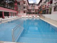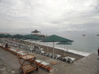 Территория отеля небольшая, но вся зеленая, ухоженная. Два бассейна, без подогрева. Детская площадка с качелями. Лежаков всем хватало, это при том, что не все площадки были открыты.Заход в море - камни, неудобно заходить, лучше купить спец. обувь. Пляж и море чистое.