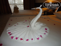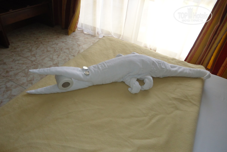 Номер у нас был на двоих. Он был просто класс. 2 двухспальные кровати, большой балкон с видом на море и бассейн. Единственный недостаток в номере не было сейфа, но сейф есть на рецепшн и он бесплатный, мы им не пользовались и нас ничего не украли. В номере есть кондиционер и холодильник, так же телевизор с русскими каналами. Мама каждый вечер смотрела КВН и Камеды клаб :-) .Убирались у нас каждый день, вымывали полы от песка , который мы постоянно заносили ногами в номер, на кроватях делали лебедей, крокодилов и много другова, пару раз даже обсыпали мою кровать лепестками роз. Над маминой кроватью извращались реже :-) , так как чаевые всегда оставляла на своей кровати :-) , может поэтому . Полотенца все новые и белоснежные, так же каждый день можно брать пляжное полотенце по карточке которую дают при заселении