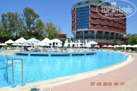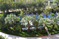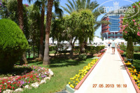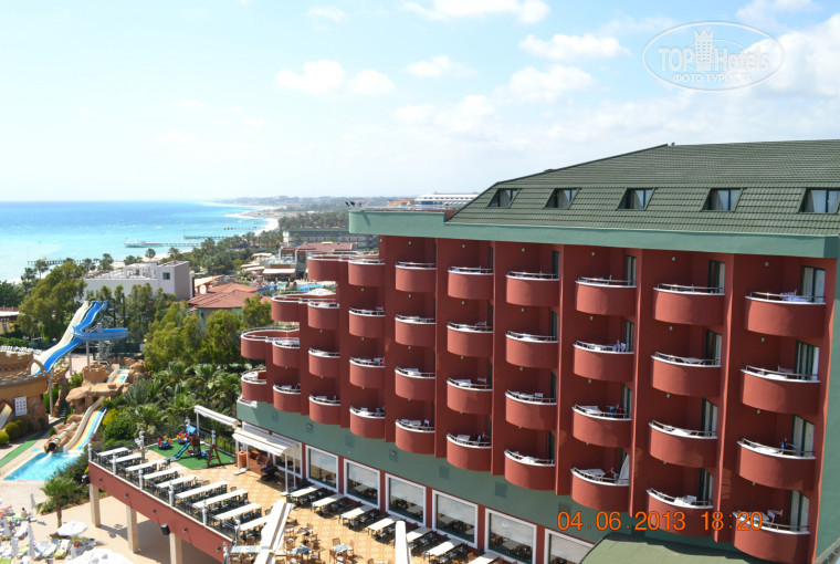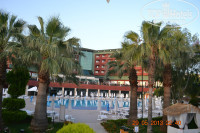 Летели 2 взр. и 2 детей (13 и 8 лет), туроператор ТезТур, время прилета в Анталию 8 утра (время Анталии), в отель приехали в 10:45. Пока готовили номер, успели на поздний завтрак. В 12-12:15 заселились в стандарт комнату (2-х спальная кровать, диванчик и кровать 1-сп.), с видом на отель Мукарнас, и на море. Устроились, переоделись и пошли знакомиться с территорией. Территория большая, красивая, много пальм, цветов и цветущих кустарников. Аллея с шатрами-бали, часто свободные. Три бассейна с 3-х разных сторон отеля (релакс, активити и детский), также 4 горки, луна-парк, и разные бары.