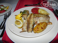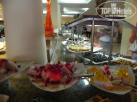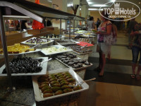 Вкусно... Кроме всевозможных салатов , было много птицы и рыбы. Очень вкусный хлеб... На свежем воздухе постоянно что-то жарится и предлагается отдыхающим , вечером у бассейна можно полакомится мороженным . Из единственного недочёта : из фруктов были только арбузы , яблоки , апельсины и зелёные (и, к сожалению - недозрелые ) сливы... Всё... Кто-то в отзывах писал про абрикосы и киви - даже запаха не учуяли. И при этом, в других ресторанах, при посещении экскурсий , нам давали персики , нектарин и дыни. Одна россиянка нам жаловалась , что приехала сюда в надежде побаловать себя халявными фруктами и ягодами, и .... "побаловала "..)))..Возможно дороговато такую ораву ягодами кормить.. ...Из личных наблюденний : арбузы безвкусные ( наши херсонские несравнимо слаще и вкуснее) , а вот яблочки и апельсины просто отменные. Апельсины долго не залеживаются , нам однажды даже не хватило, когда попробовали прийти за добавкой, а попросить как- то не хватило наглости.