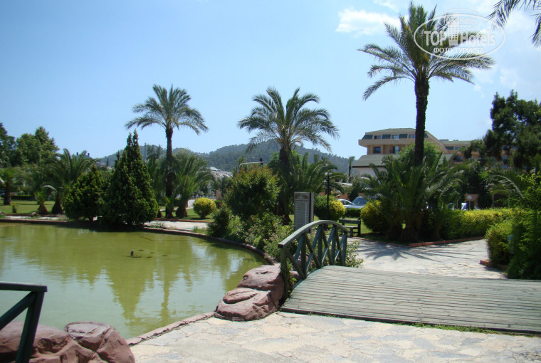 Конечно территория отеля не балует размерами но в этом есть свои плюсы - все компактно, шаговая доступность, вышел из номера и через минуту ты у бассейна, лежаков хватало всегда, в баре большой выбор напитков, причем не "юппи", а нормальных соков, кофе, выбор чая огромный, автоматы с замороженным соком, для любителей спиртного тоже всегда есть что выбрать, но не перебрать (!) Главное что все аккуратно, чисто, уборщики постоянно снуют по территории и моментально убирают там где появляется грязь, менеджер отеля строго следит за порядком. Если надо прогуляться то буквально в 100 метрах от отеля прекрасный парк с обилием зелени, павлинов, уток, кроликов, в пруду много всяких красивых рыбок. Постоянно видели хозяина отеля то в холле, то в столовой, то за чашкой турецкого чая возле бара, который внимательно следил за своими работниками.