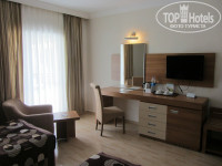 В номере сейф бесплатно, есть чайные наборы, минибар заполняется по заезду, утюг - на 1 час. Смотрели стандарт (хороший, качественный): 2 полуторки, кресло, туалетный столик,плазма, душ. Семейный 2-х комнатный (тоже хороший): 1комната -2-х спальная кровать, душ, туалетн. столик, плазма, балкончик; 2-комната 2-ярусная кровать для детей. Балконы есть не во всех номерах.