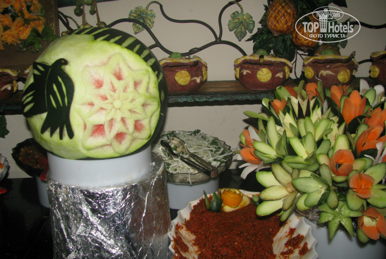 фрукты- были только апельсины, яблоки, персики -твёрдые, неспелые и потом ещё давали арбуз.
