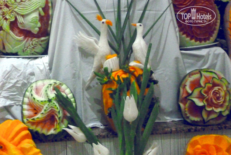 Подробнее про отель: заселили нас довольно быстро, номер был тихий, в тенечке, балкон выходил на край платного бара (ну вот по этому он и был тихий))))), в этом баре никогда никого не было. Сам номер удобный. Ну номер как номер. Телевизор, шкаф, столик, зеркало, кровати... Ну если придраться - то углубление у душа маленькое, сыровато может быть, но это решаемо с помощью полотенца на пол. 3 корпус, второй этаж, номер 3220. Вот все номера, начиная с 3219 и до 3226 - тихие. Выходят на улицу и в сторону платного бара. Ну и так по всем этажам, просто цифра этажа меняется (3320-3326, например, это будет на третьем этаже и т.д.) Убирались хорошо, причем это не зависело от чаевых. Еды полно, достаточно разнообразно. Ребенка есть чем кормить. Такого разнообразия блюд дома у нас нет))))). Я объедалась арбузом, сын не ест фрукты. По поводу десертов ничего не могу сказать, я их почти не пробовала, не люблю. Только один раз взяла себе торт какой-то - уж очень он аппетитно выглядел - со взбитыми сливками, свежими ягодами... Понравилось. Рыба тоже мне нравилась, особенно скумбрия на гриле и печень тунца. Про алкоголь тоже особо ничего не скажу - я пила мало, пробовала вино - оно сухое, по вкусу понравилось, но от него у меня была изжога. Раки пробовала. Специфический напиток, можно ради разнообразия, понравилось. Пиво в моем вкусе - не горькое, легкий вкус. Тоже иногда брала. Ребенок упивался юпи всякими - посмотрела - аллергии не было, решила, ничего страшного. Я и сама их иногда пила - мне нравилась вишневая водичка. Ну про бар на пляже уже говорили - там из еды только гамбургеры и картошка фри (она везде и всегда была)))))
