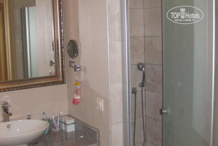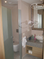 А теперь о небольших недостатках номера. Для меня было полной неожиданностью отсутствие общей двери в сан.узел, а дверь в туалет (матовое стекло) не до потолка, что крайне неудобно и создает дискомфорт, смотрите внимательно фото.