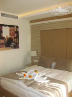 Номера новые, красивые и просторные, с рулеткой не бегала, но на глаз квадратов 50-55. В нашем номере (№ комнаты 6512) было два балкона, один с видом на море и соседний отель Gipsofila, второй на дорогу. Про интерьер писать не буду, все видно на фотографиях. В номере две комнаты, а соответственно два ТV и два мини-бара, два раздельных кондиционера, один в детской, второй во-взрослой спальне (что очень удобно).