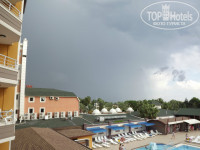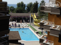 Территория отеля небольшая.Всё уютно, 2 бассейна детский и взрослый,2 небольшие горки,которые работают по часам.Пляж песчаный.Вход в море - галька и неровные плиты.