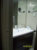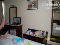 внутри отеля чисто и светло, в номере мебель хорошая! Фен центр. кондиционер (вкл и выкл) , ТВ за пульт никаких денег не оставляли…холодильник вроде 2евро день, сейф вроде платный…душ, унитаз, раковина!