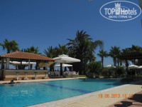 Территория отеля. Её как таковой и нет. Стоянка на 5-7 машин, вечно пустующий корт для большого тенниса (какой-то весь пооблупившийся; 9 евро в час), да бассейн рядом с ресторанчиком. Бассейн около 10 метров в длину, глубина плавно понижается от 0,5 метров до 1,8 метров. Народ возле бассейна всегда был в обилии, но нам как-то всегда хватало лежаков. Рядом с бассейном небольшой бар (пиво, мороженое), в котором я правда за неделю ни разу не увидел официанта, который что-то кому-то наливал бы. За этим баром было 4-5 "наборов" - диван + 2 кресла + столик (очень, кстати, удобные и с отличным видом на море).